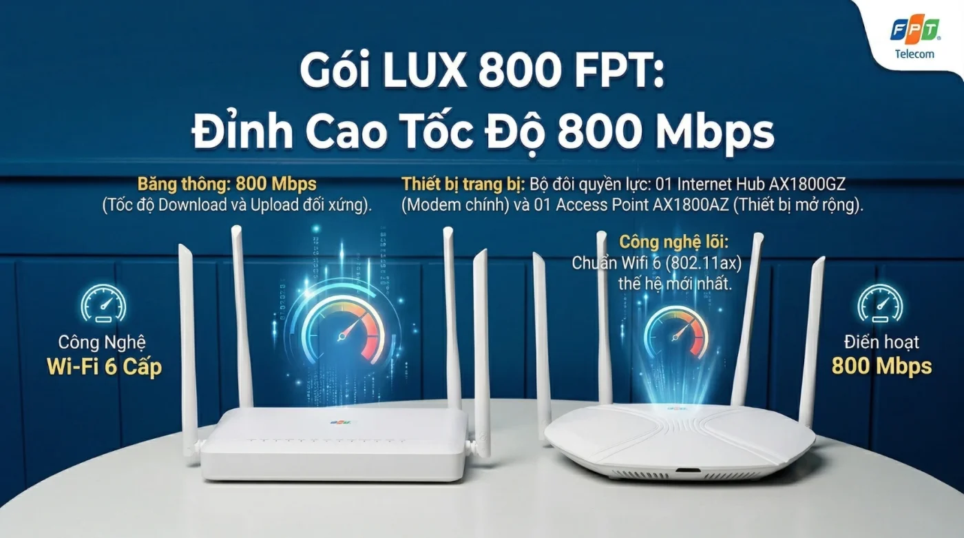 LUX 800 FPT không đơn thuần là một dịch vụ internet, nó là biểu tượng của sự tốc độ, ổn định và đẳng cấp dịch vụ. Nếu bạn đang tìm kiếm một giải pháp mạng “không góc chết” để phục vụ công việc và đam mê, LUX 800 chính là câu trả lời.